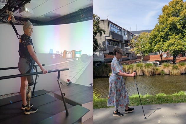 Jeanette rehabilitating on the motion capture treadmill (left) and walking with her new prosthetic (right)