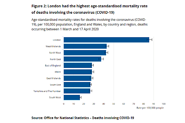 London had the highest age-standardised mortality rate with 85.7 deaths per 100,000 persons; this was statistically significantly higher than any other region and almost double the next highest rate.
