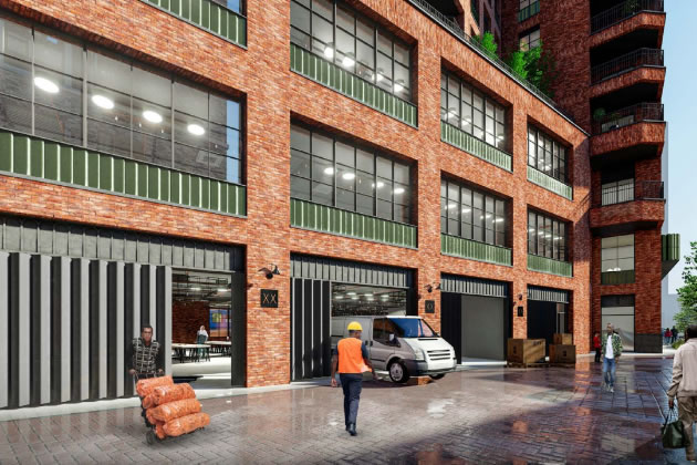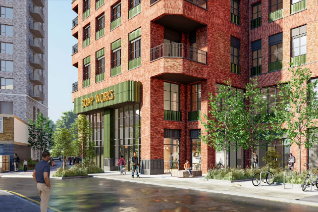 The Soap Works development consists of a base podium, which houses the industrial and commercial above which there would be three towers of 12, 14 and 18 storeys high. There would be communal landscaped terraces on the 3rd, 12th and 15th floors and an entrance for residents separate from the industrial space as well as a double height café.
