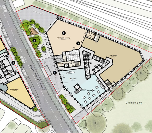 The latest proposal (23/0014/FUMOPDC) is at 5-7 Park Royal Road and includes the Lower Park Trading Estate (W3 6XA). The site is adjacent to Acton Cemetery and is currently occupied by low-rise residential buildings.