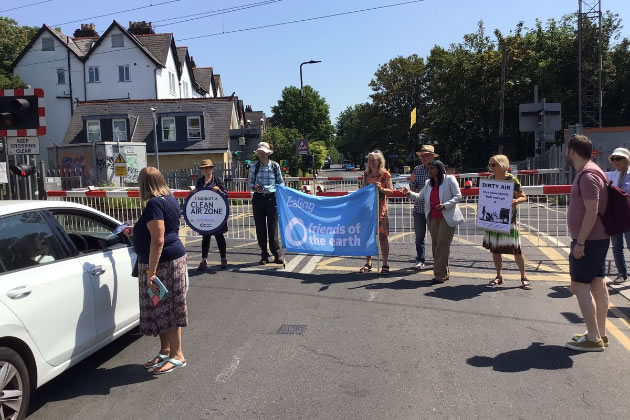 Unlike the protests that have taken place recently by Just Stop Oil, the participants weren’t holding up traffic. That only happened as normal when the barrier was lowered. Drivers were approached and reminded to turn off their engines while waiting for the train to pass. Many had failed to spot or were ignoring the signs requesting them to do so. Drivers who had left their engines running got a leaflet while those that had switched off were offered a sweet.