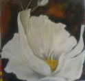 The painting measures 70cm x 70cm and is a close up of a white poppy. The layers of oil paint give the painting a textured, 3-dimensional feeling.