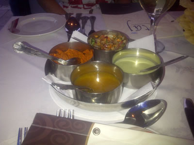 Recommended to start: a shared mixed platter, including vegetable and red chilli pakuras and gram flour pastry samosas, chicken, lamb tikka. Packed with flavour but, be warned, very filling. A gorgeous dark sauce we couldn't identify was drizzled on top; upon enquiry we learned its recipe is a fiercely guarded secret of the chef so all I can tell you is, it's delicious – try it. Ditto the chef's own take on sauces to accompany papadoms; excellent.