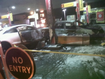 Eyewitnesses passing Gillette Corner at around 10.45 pm last night (Thursday) spoke of a "raging fire" and an explosion. Apparently a car lost control and smashed straight into the petrol station near Brentford.
