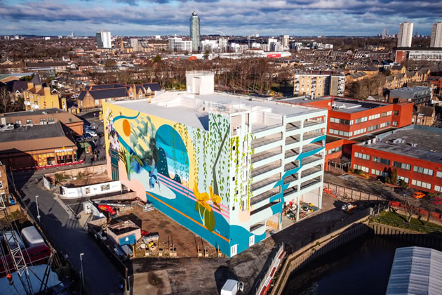 The car park mural, which was designed by Jo Hicks (better known as Hixxy), was commissioned by The Brentford Project to reflect Brentford’s own nature, waterways and heritage (including the signature bees of the Brentford football club). It was unveiled in January 2021 to improve the look of the concrete structure.