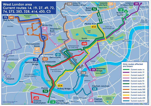 Route 27, which used to run through Chiswick before the service was truncated, now operates between Hammersmith and Camden/Chalk Farm via Mornington Crescent, Paddington, Regent’s Park, Notting Hill, Kensington, Olympia. TfL is proposing to reroute the 27 to operate between High Street Kensington and Clapham Junction to keep key journey links currently served by route C3 if it were to no longer run.