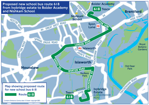 School route 618 would run from Ivybridge Estate via Twickenham Road, Worton Road, Bridge Road and Syon Lane. There would be two journeys each school day, one in the morning (to Syon Lane) and one in the afternoon (to Ivybridge Estate). Subject to consultation, the service would start running in early next year and would use the same roads and bus stops as the H28 in this area.