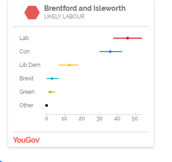 This chimes with the detailed constituency level polling recently released by YouGov which rates Brentford & Isleworth as ‘likely Labour’, and shows Ruth Cadbury getting around 45% of the vote with Seena Shah under 40% and Helen Cross just over 10%
