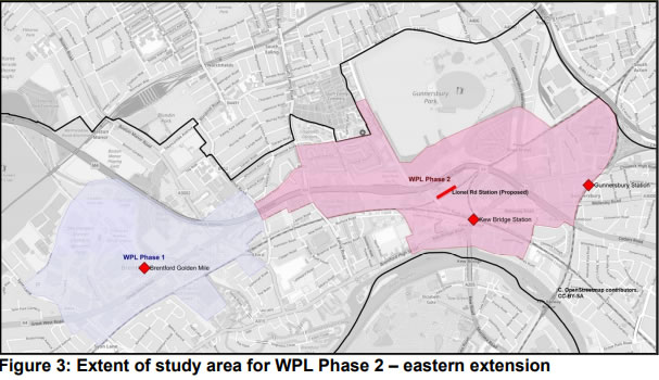 There is also to be a further feasibility study and initial consultation on a possible second WPL scheme covering the eastern extent of the Great Western Corridor opportunity area. This could cover the eastern stretch of the Golden Mile along the A4, the area around the new Brentford FC stadium, the Power Road estate and Chiswick Business Park. The funds levied would go to the provision of a new station at Lionel Road which would be served by the proposed West London Orbital train service. The scheme could also help support transport improvements at Gunnersbury and Kew Bridge stations, alongside wider bus and cycle/pedestrian improvement schemes.