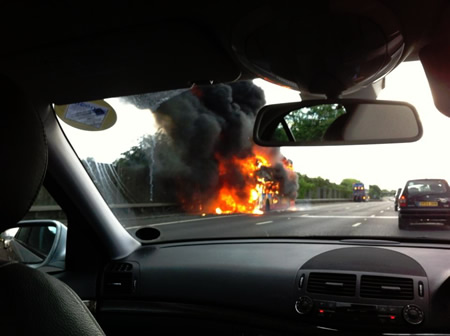 The M4 motorway was closed yesterday evening (13th June) after a bus caught fire. Nobody is reported to have been hurt as a result of the fire. The vehicle is believed to be an open top tour bus that was not carrying any passengers. The driver and a co-driver escaped from the vehicle before the Fire Brigade arrived.