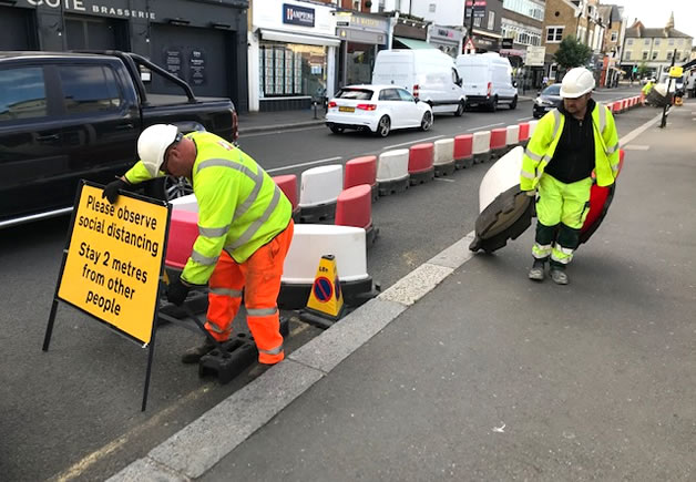 Hounslow Council contractors reallocating road space away from cars.
