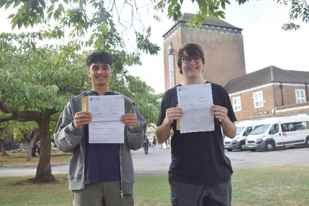 Once again, the school’s vocational offer was strong. Three students earned all Distinction*s – the highest possible grades. Both Curran Bains and Hayden Wilson took the CTEC qualification in sport and earned a Triple Distinction* each. They will both advance their studies of how sport can be applied in the real world, with physiotherapy and sports & exercise psychology degrees respectively. This year’s group showed that the vocational courses can help students specialise in their subject areas. Darshpreet Brar took CTECs in business (Distinction* and Distinction*) and applied science (Distinction*) – in September he will read business management at Queen Mary. Arham Jan focused more on IT, earning a Double Distinction* in the CTEC course along with an extra Distinction in applied science. He is going to Brunel University to read computer science.