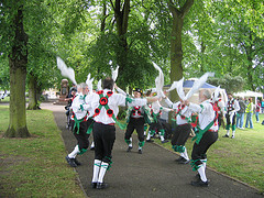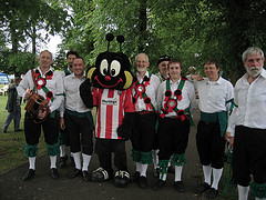 Buzz Bee poses with the Morris Men. He didn't quite dare have a go!