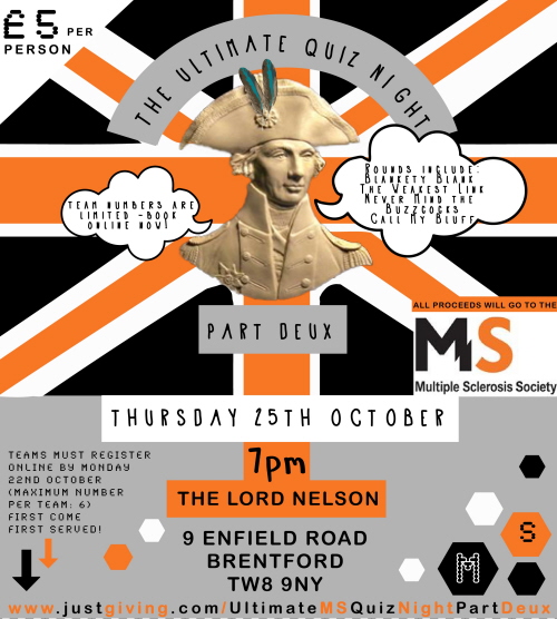 If you'd like to register a team, please email blindedfish(at)hotmail.comwith names of the team and make your 5 pound donation (per person) online at: www.justgiving.com/UltimateMSQuizNightPartDeux