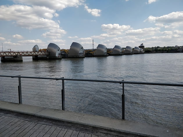 Then 3 sticky hours tramping round dockland in the afternoon sun with people from the development corporation, Newham council, developers LendLease – who are converting the enormous and listed former Spillers flour building - and the architect of the Thames Clipper terminal they are about to open there. I took one look at this chap and thought “architect”: was it the heavily orange-rimmed spectacles or the blue and white patterned sneakers, or a combination? Anyway the design of his pontoon looked great in the pictures. The piles are already there and the actual pontoon and bridge are being fabricated in the Netherlands, shortly to be shipped here and craned into place for soft opening in September. We ended up in a large park right next to the Thames Barrier, imaginatively named Thames Barrier Park. I’d never seen the barrier up close and personal.