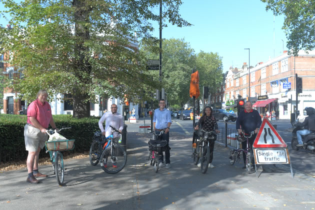 Friday morning we’re out in Chiswick to meet the walking and cycling commissioner from the GLA, Will Norman, to celebrate work starting on the temporary version of Cycleway 9 through Chiswick. We meet on Turnham Green Common – Will on his Brompton, Candice Atterton and Hanif Khan on their bikes, me on my Elephant (Elephant bike, for clarity) and Steve Curran on his newly-acquired (on a council hire scheme) Brompton. I ask if he parked in Sainsbury’s and he gets very narked and points out that his physical state bears witness to him having cycled all the way from Brentford (yes I know that’s not the Tour de France but an excellent start).