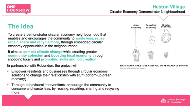 In the afternoon I am run through the plans for the Heston Village circular economy pilot. This is an ambitious experiment, funded partly by ReLondon (the London wide Recycling and waste authority) to see how we can improve repair, reuse and recycling in a tightly defined area. The idea is we will use this as a pilot for Hounslow, for London and for other areas and it’s quite an exciting initiative. We hope to start implementing later this year and monitor it over the next two years to understand what works, refine and learn lessons prior to promulgating more widely.