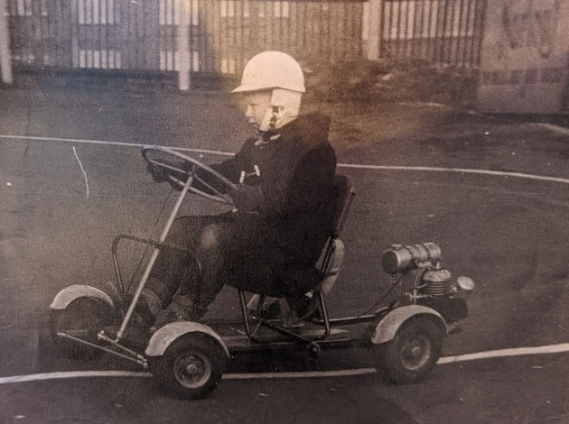 Today, normally Blogday, I has a day off and went to see my 2 sisters near Milton Keynes – a place that is equally far from the 3 of us. Nice lunch with no booze for me. Sister had a picture from her archive, of her little brother on a GoKart at his dad’s safety course in LIverpool