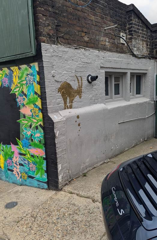 I have been wandering the streets, as I do, and a few days I came upon a familiar image in an unfamiliar place. This is on the back of the Weir pub in the centre of Brentford.