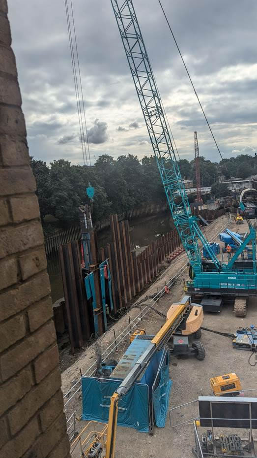 Just this then. Those of us who like me live in Ferry Quays, on boats on the Brent, in parts od Brentford Dock and to a lesser degree around Griffin Park are having to put up with sometimes deafening (I need no help in getting deaf) and vibrating (may be good for circulation in my feet) coming from the river wall replacement progressing (very slowly) on the former Heidelberg site. This is how it looked from my block a couple of days ago.