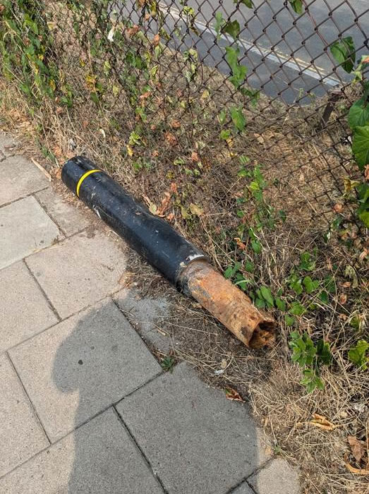 On further sleuthing, turns out this was the remains of a bollard. Poor bollards have a very limited life, due to dozy drivers (including me. Though not guilty m’honour, never done it in Brentford.)
