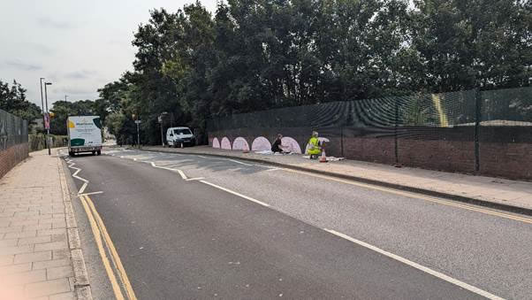 It turns out they are working with some charity which works with the railway and had been commissioned to improve the bridge. This is surprising as the railway authorities usually tell us that cleaning graffiti off a bridge runs a risk of setting off catastrophic failure and should not be undertaken by humble council employees. Having said that, I never know whether it is a Network Rail, or SW trains or TfL or the Duke of Hazzard who owns each bridge so they may have different policies. The two women told me they were having help by pupils at Green Dragon Primary School to develop the decorations, which sounds fab to me from a number of different angles. I spent several years trying to get them to sort out the horrible boards that used to be atop the walls, except where they were broken. To my delight they disappeared recently and were replaced by green wire fences, which are an enormous improvement, if no oil painting. Soon we will have both, perhaps.