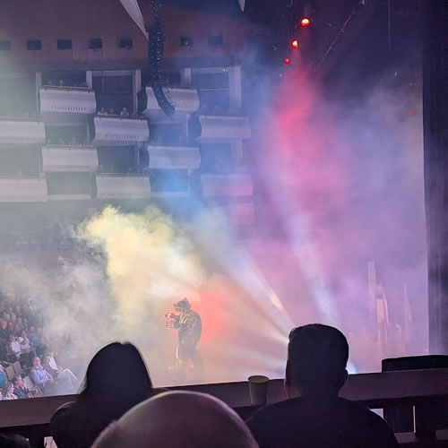 He was dressed as the Man-Wulf (as you can just about see). It was hilarious when I could hear what he was saying. See him if you get a chance - he's excellent live.