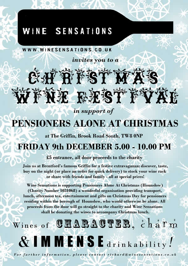 "Join Wine Sensations on the 9th December at the Griffin in Brentford for a festive extravaganza: discover, taste, buy on the night (or place an order for quick delivery) to stock your wine rack or share with friends and family - all at special prices!"Wine Sensations is supporting Pensioners alone At Christmas (Hounslow) (Charity Number 1031068) a wonderful organisation providing transport, lunch, afternoon tea, entertainment and gifts on Christmas Day for pensioners residing within the borough of Hounslow, who would otherwise be alone. All proceeds from the door will go straight to the charity and Wine Sensations shall be donating wine to accompany Christmas lunch.