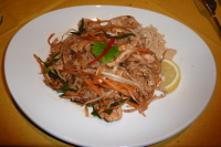 I had a Mixed Starter, with Thai spring rolls, prawns on toast, chicken wings and satay. Although the spring rolls were fairly ordinary, the toast tasted more of prawns (prawnier?) than eaten elsewhere and were more visible. The chicken wings had a tasty crunchy coating which made them more interesting to eat and the satay had a liberal helping of dip to enjoy. My guest had Tom Khan Hed, a vegetarian creamy coconut soup with mushrooms, lemon grass, galangal and lime leaves. Never having heard of galangal we asked and discovered it to be a Thair version, more or less, of ginger, with slices of it in the soup being a bit crunchy and woody, with a spicy explosion when bitten into. The lime leaves also smelt very strongly of lime and the soup had many different individual flavours to discover and enjoy.