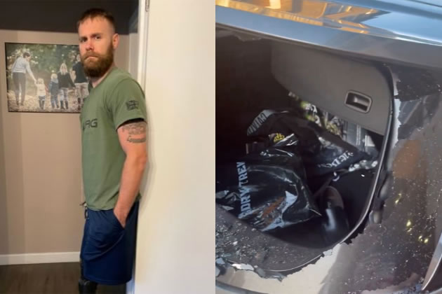 Mark Ormrod (left) and the smashed in rear window of his car. Picture: X