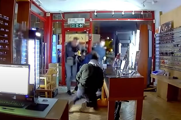 The attempted theft took place at 4.19am on 30 April. Initially, the window of the shop is smashed in with what looks like a breeze block and the thieves make for the displays of sunglasses frames, throwing them into a Sainsbury’s bag-for-life.