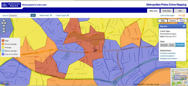 The study's findings appear to be in direct contrast to actual crime figures in Chiswick where the average price of a property is over £650,000. As can be seen from the screen print below, many of the wards in Chiswick fall in the High and Above Average categories for residential burglaries.