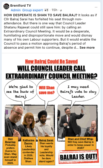 Attending formal meetings is a crucial part of showing commitment to the councillor role; it is recorded in our attendance record. There were rather more apologies In November than usual and one notable absentee has led to more red faces in the Labour group. Councillor for Syon & Brentford Lock Balraj Sarai’s absenteeism record is notable; he hasn’t been seen for so long it’s hard to remember what he looks like. The rule is that if you are absent for six months, you forfeit your seat creating a vacancy. With no formal meetings in the diary until after his six months have elapsed, Labour needs to respond. The council can call an EGM to debate whether the six-month rule should be waived to avoid a by-election but it would be humiliating. If you haven’t discovered the uniqueness of the Brentford Today & TV Facebook page, do have a look. It often tests Labour’s conscience and has been leading on Cllr Sarai’s lack of attendance.