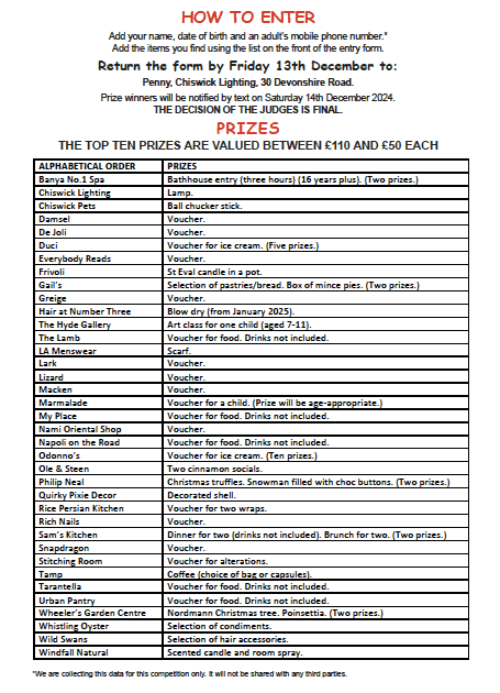 What a pleasure it was bumping into a family of three, the youngest clutching a scavenger hunt competition form and very keen to say what she had found (eight so far, all of them right). If you know anyone aged five to 11, do encourage them to take part in what the residents who have organised it hope will become an annual Christmas tradition. Children are invited to look for unexpected items in the windows of various shops. Shops have enjoyed deciding what to display and how hidden or obvious it should be, as much as those looking for them are enjoying the hunt. The competition sheet lists the shops taking part but not what to look for. As a parent said, the prizes are very generous – the top 10 prizes are valued at between £110 and £50 each. Pick up a competition form from Chiswick Lighting, 30 Devonshire Road (it’s closed on Sunday) or download it here. Return it there by 5pm on Friday, 13th December. The winners will be notified by text the next day.
