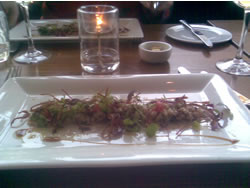 The next course was salad of bulgur wheat and puy lentils with parsley, mint, pomegranates and crispy red onions. It doesn’t sound very exciting and pessimists both we expected something boring. We were wrong. With the herbs, pomegranate seeds, red onions and a swirl of pomegranate syrup the bulgur and lentils were lifted above the ordinary. The accompanying wine was a 2007 Riesling from Germany.