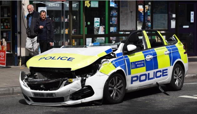 London Fire Brigade firefighters were called to remove the roof from the squad car to enable the safe extraction of the officers.