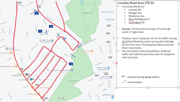 Five maps have been put into limited circulation showing proposed access restrictions on Bramley Road/Airedale Road, Mattock Lane, Loveday Road, Broadway South and Broadway North. Ealing have previously announced that nine LTNs are planned.