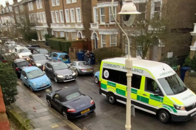 An ambulance stuck in the resulting traffic on Lammas Park Road