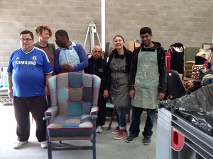 Upholsterer Alex Watson (second from left) with some of the Accession team with a chair recovered from donated fabric as diverse as jeans and a tweed jacket.