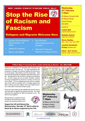 The West London Stand Up To Racism group are organising the public rally, under the title of ‘Stop the Rise of Racism and Fascism’