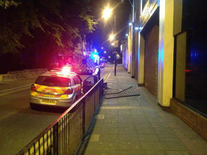 Police were informed that a car had been driven over the pedestrian walkway and had knocked over railings, causing damage to the pavement and kerb.
