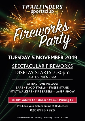 Meanwhile on 5 November there will be fun for all the family with a spectacular fireworks display, licensed bars, food stalls, stilt walkers, fire eaters & laser show at Trailfinders Sports Club Fireworks Display in Ealing. Gates open at 6pm, display starts at 7.30pm. £7 adults, £3 under 14s, parking £5. It is strongly advised to buy tickets in advance online. www.tfsc.co.uk