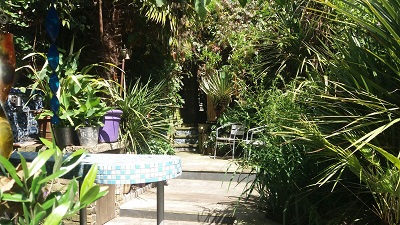 This area of the garden is filled with a vast selection of exotic but hardy plants. There are grapevines,oleanders, palm trees, figs as well as Cordylines, Cannas and Yuccas.