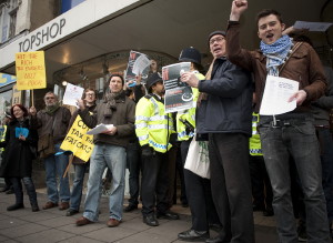 Protestors were chanting slogans "If you wanna sell your stuff, pay your tax" to draw attention to the fact that TopShop owner Sir Phillip Green avoided a £300 million tax liability by paying his Monaco based wife £1.2 billion.