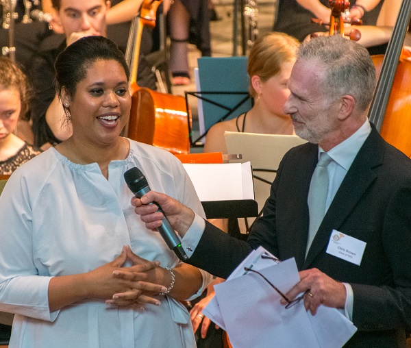 Leading young composer Hannah Kendall with Christopher Brown, Chair, Ealing Youth Orchestra introduced the world premiere performance of weaves flowers and leaves, a piece commissioned by EYO for its 60th Anniversary Gala Concert.