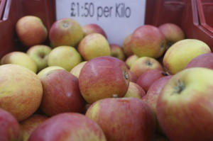 In my basket: A kilo of perfect looking Cox apples – the difference in quality from supermarket apples was startling.