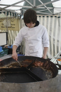 Alex was drawing people in from the damp streets cooking sausages, bacon, pork steak and onions on a griddle. Behing the counter there was traditionally cured ham and bacon, at least 15 different kinds of sausage to ruminate over, and huge slabs of pork belly.