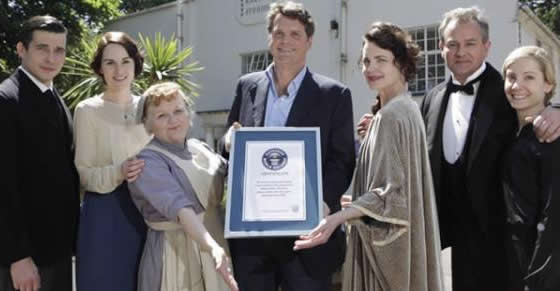 The cast and crew of Downton Abbey were on hand to honour the studios, and actor Hugh Bonneville (@hughbon) tweeted the photo saying : '#DowntonAbbey bods presenting Barnaby Thompson with Guinness World Record for oldest continuously operating studios.''