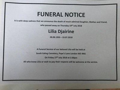 Funeral of Lilia Djairine will take place in South Ealing Friday 27th July