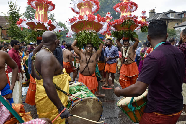 The festival honours the victory of the war god Murugan over a demon using a divine spear. As well as pulling the chariots devotees in traditional dress rolled along the road, carried milk jugs on their heads and sported elaborate piercings. Offerings in baskets are presented to the gods. Musicians accompanied to the parade adding to the festive atmosphere. This year there was also a fundraising market in Dean Gardens.